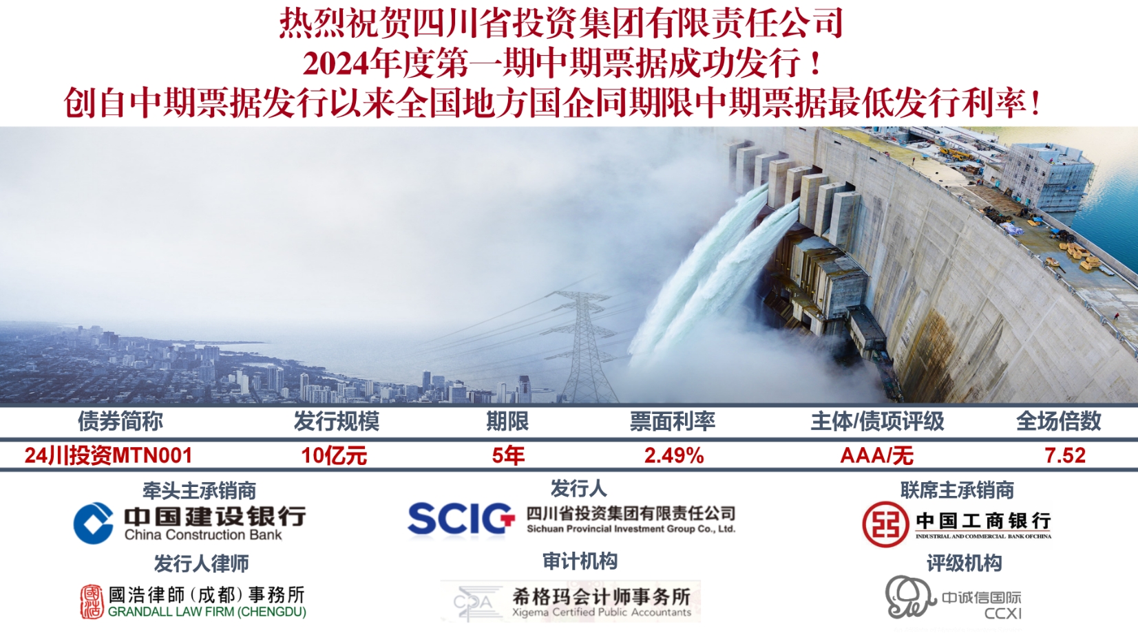 4月18日,川投集團(tuán)成功發(fā)行2024年度第一期中期票據(jù),創(chuàng)下自中期票據(jù)發(fā)行以來四川省同期限中期票據(jù)最低發(fā)行利率和全國(guó)地方國(guó)企同期限中期票據(jù)的最低發(fā)行利率記錄。