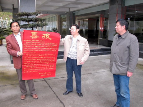 (左二)從葛洲壩項(xiàng)目部經(jīng)理劉勇(右一)手中接過(guò)喜報(bào)。