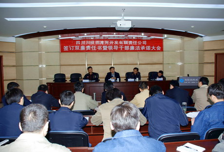 會上,孫志祥代表經(jīng)營班子成員向全體員工進(jìn)行了廉潔承諾,同時代表公司與各部門負(fù)責(zé)人簽訂了《廉潔經(jīng)營、廉政建設(shè)責(zé)任書》。公司副總工程師、大發(fā)項目管理部經(jīng)理何廷剛代表公司部門負(fù)責(zé)人向全體員工進(jìn)行了廉潔承諾。經(jīng)營班子成員和各部門負(fù)責(zé)人都鄭重地在廉潔承諾書上簽了字。