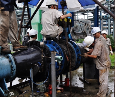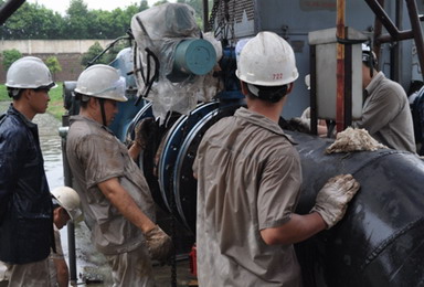 由于16日晚到17號上午的持續(xù)暴雨,造成了江邊取水泵房旁的山體塌方,廠區(qū)取水管道,電線電纜統(tǒng)統(tǒng)拉斷,取水工作已無法進(jìn)行。公司領(lǐng)導(dǎo)迅速組織各部門緊急會(huì)診,提出新敷設(shè)管道并入樂電天威江邊取水管道的方案,在得到樂電天威的支持后立即實(shí)施,電氣維修員在最短的時(shí)間內(nèi)搶修好配電箱,建立了臨時(shí)施工電源,確保了碰口工作順利完成。