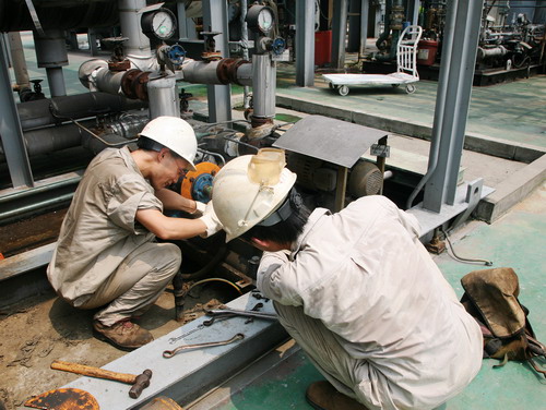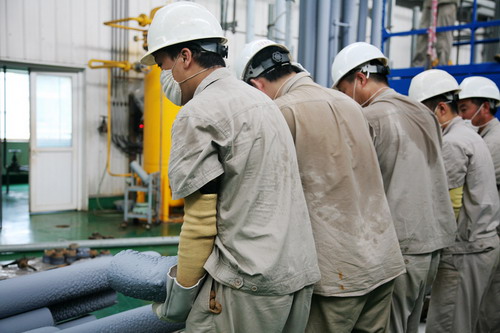 每年七月、八月高溫天氣是多晶硅生產(chǎn)設(shè)備故障的頻發(fā)期,十分不利于多晶硅的生產(chǎn)。尤其在今年,持續(xù)的高溫“烤”驗著新光人的意志和多晶硅生產(chǎn)設(shè)備的安全。為了實現(xiàn)月產(chǎn)100噸的目標(biāo),新光人懷著飽滿的熱情,堅持奮戰(zhàn)在一線。我們看到:烈日下的巡檢人員,認(rèn)真仔細(xì)地對工序設(shè)備儀表進(jìn)行檢查,沒有半點松懈,工作服被汗水浸濕一次又一次;設(shè)備檢修員頂著烈日、冒著酷暑,順利完成了HCl冷凝單元壓縮機、鹽水冷凍機組、氫化爐檢修、淋洗塔清堵與消缺、電氣防雷設(shè)備安裝、硅芯爐檢修、鍋爐檢修、儀表各系統(tǒng)消缺、重大關(guān)鍵設(shè)備巡檢等任務(wù);回收工段的操作員站在CDI設(shè)備前仔細(xì)記錄著每一個參數(shù),監(jiān)控溫度變化;還原爐裝拆工序的操作員冒著操作環(huán)境的高溫,熟練有序的進(jìn)行裝拆爐,保證質(zhì)量的情況下盡量縮短裝拆爐時間;老專家們堅守在現(xiàn)場悉心指導(dǎo)技術(shù)人員做技改實驗;為搶修江邊水泵,基建人員頂著酷暑堅守崗位,組織現(xiàn)場大型機械設(shè)備持續(xù)作業(yè)……