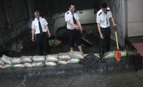 “七.三”強(qiáng)降雨時(shí),南府項(xiàng)目出現(xiàn)從地下車(chē)庫(kù)進(jìn)口坡道處和消防轉(zhuǎn)接器管道處向地下車(chē)庫(kù)內(nèi)漏水的緊急情況,積水威脅車(chē)庫(kù)和配電室安全。值班經(jīng)理汪秀云果斷指揮當(dāng)班人員分頭通知車(chē)主,把停放在地下車(chē)庫(kù)內(nèi)的轎車(chē)迅速轉(zhuǎn)移到庫(kù)外安全地點(diǎn),再指揮秩序維護(hù)員、環(huán)境維護(hù)員和設(shè)備維養(yǎng)員用沙袋在車(chē)庫(kù)坡道外和配電房門(mén)口壘砌擋水墻,啟動(dòng)潛水泵和組織人力不斷排水,防止積水進(jìn)入配電房,同時(shí)將現(xiàn)場(chǎng)情況報(bào)告項(xiàng)目經(jīng)理。項(xiàng)目經(jīng)理周道久也一邊電話(huà)指揮,一邊用最快速度趕到了現(xiàn)場(chǎng)指揮排險(xiǎn),確保了南府項(xiàng)目未發(fā)生任何事故。