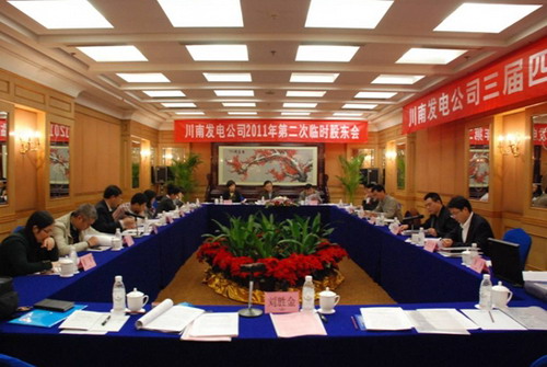 2011年11月16日,四川瀘州川南發(fā)電有限責(zé)任公司(以下簡稱公司)2011年第二次臨時股東會、三屆四次董事會在四川成都召開。會議由川投集團公司副總經(jīng)理、公司董事伍康定主持。公司副董事長王文琦,董事郭愛國、張維群、肖群英、李勝章、唐得旗參加會議。監(jiān)事會主席任明霞,監(jiān)事鄭世紅、黃泰慧及公司相關(guān)管理人員譚先明、謝偉平、黃松、劉云戈等列席會議。