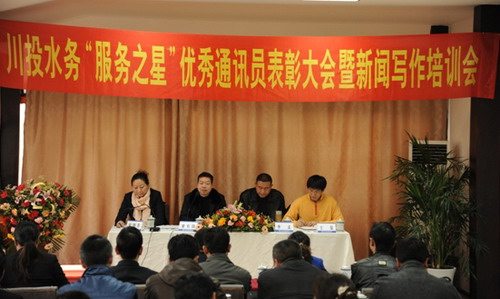 3月15日下午,川投水務(wù)2011年度“服務(wù)之星”、優(yōu)秀通訊員表彰大會(huì)暨新聞寫作培訓(xùn)會(huì)在邛崍平樂古鎮(zhèn)濯纓水閣酒店舉行,川投水務(wù)總經(jīng)理梁有國(guó)出席會(huì)議,綜合部經(jīng)理何曉蘇主持會(huì)議,來(lái)自川投水務(wù)所屬公司部分班子成員、綜合部經(jīng)理、“服務(wù)之星”、通訊員代表,以及川投水務(wù)本部通訊員和相關(guān)人員共四十余人參加了會(huì)議。