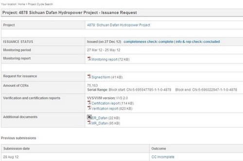 聯(lián)合國(guó)氣候變化框架公約網(wǎng)站關(guān)于田灣河大發(fā)水電站CDM項(xiàng)目通過(guò)首次簽發(fā)頁(yè)面