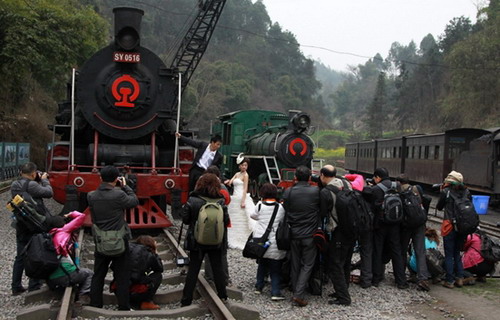 今年春來(lái)早,花開(kāi)正當(dāng)時(shí)。春暖花開(kāi)之際,嘉陽(yáng)小火車又迎來(lái)了別樣的浪漫之旅。3月1日來(lái)自成都、宜賓和樂(lè)山的78位攝影愛(ài)好者和游客坐上了一趟獨(dú)具特色的婚紗模特?cái)z影專列。嘉陽(yáng)小火車2013年“花季之旅”也正式拉開(kāi)序幕。