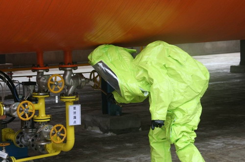 川南發(fā)電公司脫硝技改項(xiàng)目采用液氨作為脫硝反應(yīng)劑,液氨屬重大危險(xiǎn)源,一旦發(fā)生泄漏,將可能引發(fā)中毒、爆炸等不安全事件,為此公司高度重視,不斷加強(qiáng)安全預(yù)防、教育培訓(xùn)相關(guān)工作。為檢驗(yàn)和提高員工對液氨泄漏事故的應(yīng)急處置能力,進(jìn)一步增強(qiáng)員工安全意識,公司專門組織了此次事故演練。14:30,演練正式開始。事故假設(shè)兩名化學(xué)運(yùn)行人員在巡視檢查時(shí)發(fā)現(xiàn)#1液氨儲罐出口管路一次手動(dòng)門后法蘭泄露,泄露液氨化為氣態(tài)氨并迅速擴(kuò)散,現(xiàn)場空氣中氨濃度超標(biāo),員工A中毒昏倒。員工B迅速佩戴防護(hù)面具,把中毒人員往上風(fēng)口運(yùn)送,并向值長匯報(bào)。14:38,應(yīng)急人員相繼到達(dá)現(xiàn)場,嚴(yán)格按照應(yīng)急演練方案進(jìn)行處置工作。14:42分,一名設(shè)備部人員身著防護(hù)服、佩戴正壓式空氣呼吸器,在運(yùn)行人員的配合下,成功隔離漏泄點(diǎn),應(yīng)急演練結(jié)束。