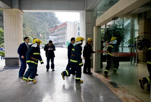 11月19日15時(shí)40分,田灣河公司電站現(xiàn)場營地接待中心物業(yè)值班員向營地保衛(wèi)值班室報(bào)火警:接待中心三樓電纜線井發(fā)生火災(zāi),有大量毒煙,火勢未得到控制,并有增大跡象,目前正在組織疏散撤離,暫無人員受傷,請快速組織人員增援救火。同時(shí),值班人員大聲呼喊:著火啦!?。∷腥藛T快速撤離接待中心大樓?。。?BR> 情況緊急,值班人員接到報(bào)警后立即向火災(zāi)事故應(yīng)急辦公室技術(shù)與安全部負(fù)責(zé)人報(bào)告,爾后又層層向公司現(xiàn)場值班領(lǐng)導(dǎo)、公司總經(jīng)理報(bào)告。總經(jīng)理指示立即成立火災(zāi)事故應(yīng)急救援指揮部,現(xiàn)場由熊宇負(fù)責(zé)指揮。按總指揮要求,現(xiàn)場指揮長命令:拉響警報(bào)器,啟動火災(zāi)事故二級應(yīng)急響應(yīng),疏散組快速組織接待中心大樓人員安全撤離,滅火行動組立即組織兼職消防隊(duì)員、義務(wù)消防隊(duì)員投入滅火戰(zhàn)斗......一道道緊急命令從指揮部發(fā)出,各應(yīng)急救援小組快速集結(jié),按公司火災(zāi)事故應(yīng)急預(yù)案有序開展救援行動。