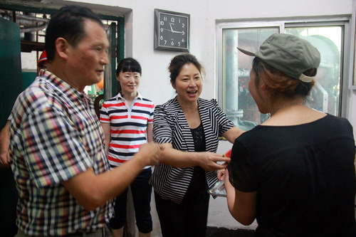 自入伏以來,氣溫節(jié)節(jié)攀升,連續(xù)的高溫天氣威脅著生產(chǎn)崗位職工們的身心健康,同時也牽動著上級領(lǐng)導(dǎo)的心。7月28日,在公司杜勤、鐘衛(wèi)旗等領(lǐng)導(dǎo)的陪同下,川投集團慰問組一行首先來到煤矸石發(fā)電廠,聽說上級領(lǐng)導(dǎo)特意來看望慰問大家,檢修車間的工人師傅們放下手上的活等候在了廠區(qū)大門,穆主席將切好的西瓜遞到工人師傅手中并關(guān)切地說:“高溫酷暑,你們?nèi)匀粓允卦诠ぷ鲘徫簧戏浅P量?,我代表集團對你們的辛勤工作表示感謝!在夏季高溫環(huán)境下大家一定要做好防暑降溫和自身保護,確保安全生產(chǎn)。”慰問組一行先后到電廠鍋爐、汽機等高溫生產(chǎn)崗位,以及礦區(qū)炭壩等露天作業(yè)場所將清爽解渴的冰粉,香甜可口的西瓜送到職工們手中,親切問詢職工們的生產(chǎn)生活情況,并叮囑他們注意安全、保重身體。一句句關(guān)切的話語尤如一陣陣清涼的風(fēng)吹進了職工們的心坎兒里,大家紛紛表示雖然公司目前處于非常困難的時期,集團領(lǐng)導(dǎo)的關(guān)懷我們信心倍增,作為企業(yè)的一員我們會理解和支持公司的各項改革舉措,以更加飽滿的熱情努力工作,團結(jié)一心,與企業(yè)共渡難關(guān)。(羅誼莉)